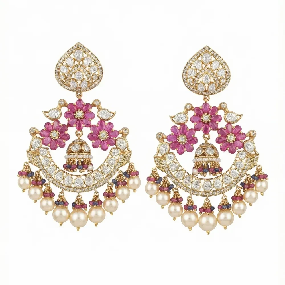 ROSE CUT CHAKARI POLKI RUBY OVAL CHAND EARRING |